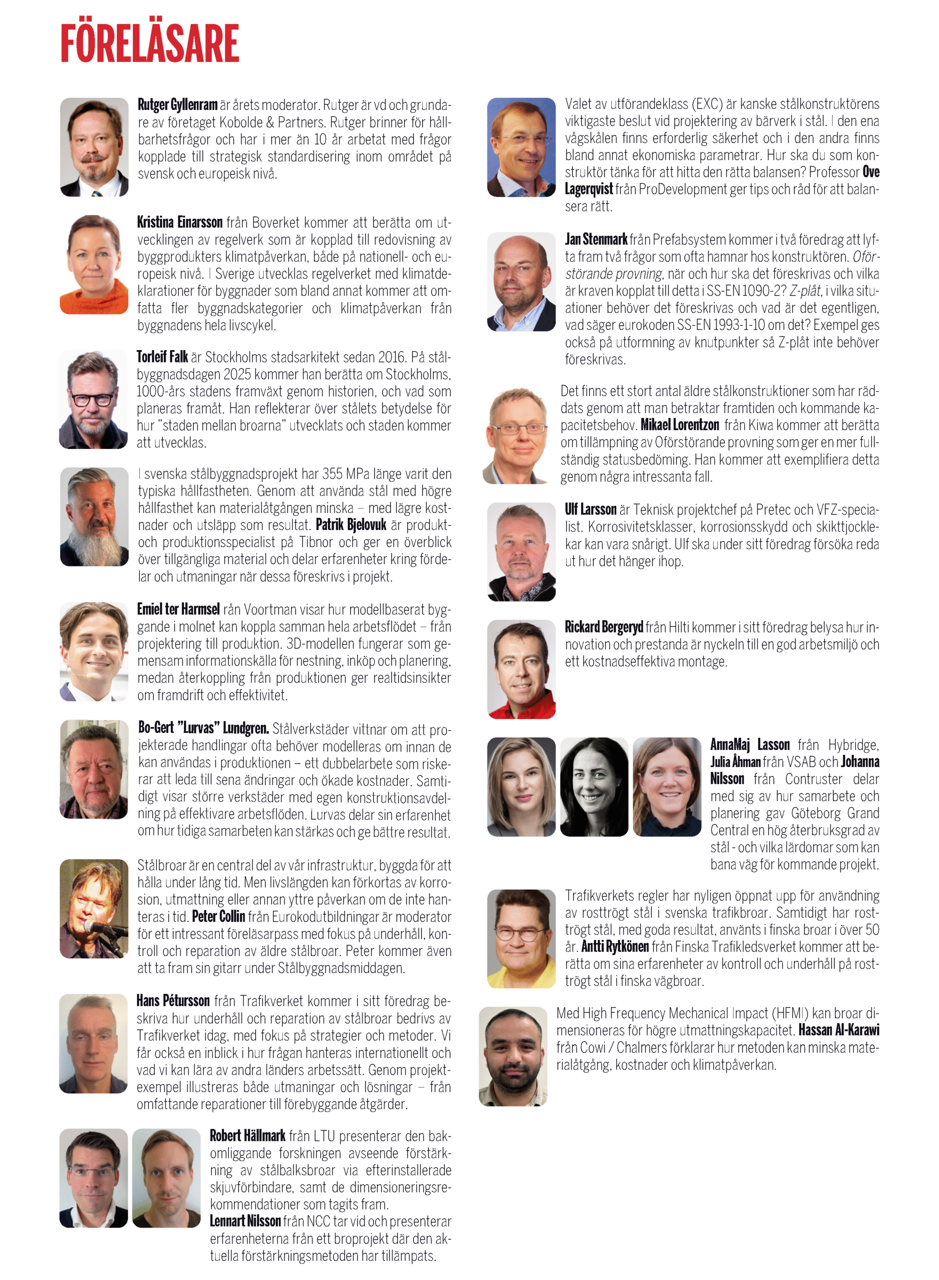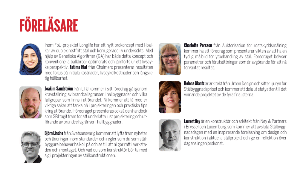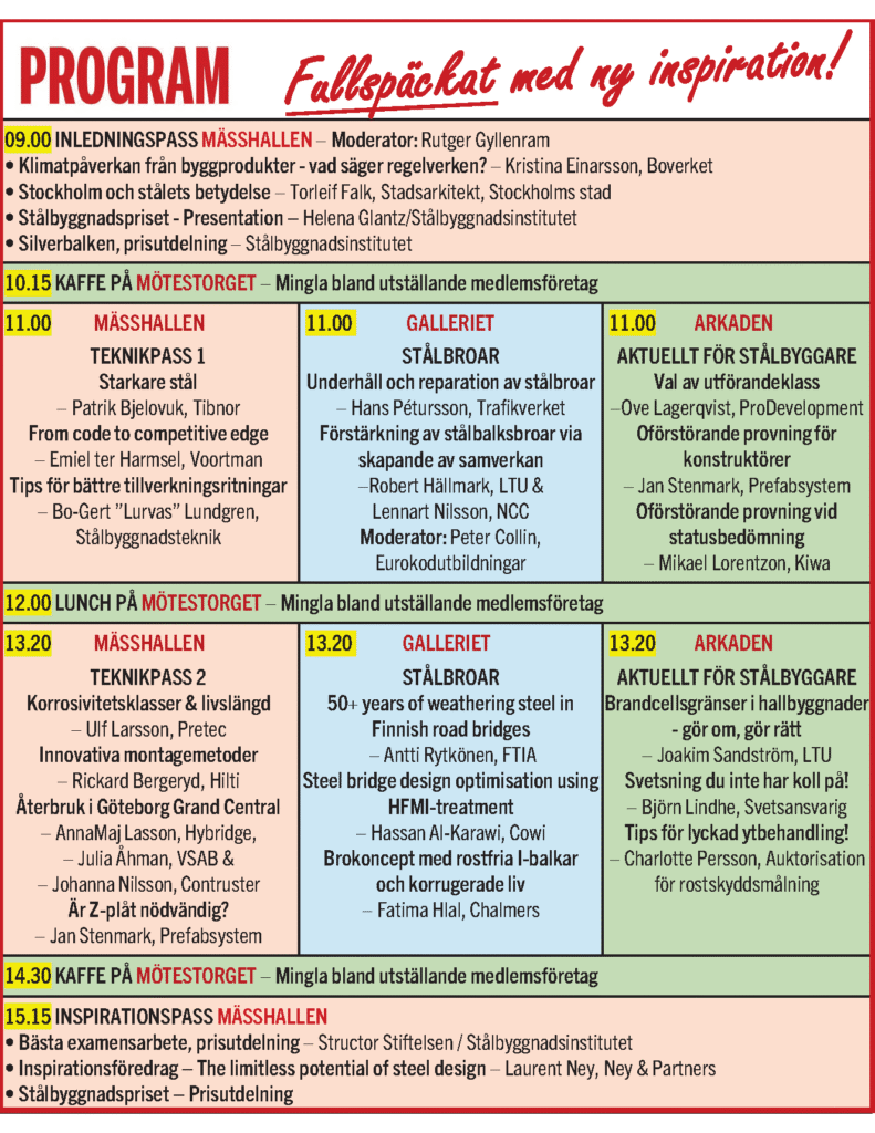 Stålbyggnadsdagen genomförs på Münchenbryggeriet i Stockholm 25 november 2025 och här nedan kan du se vad du kan ta del av i det fullmatade programmet (med reservation för ev ändringar).