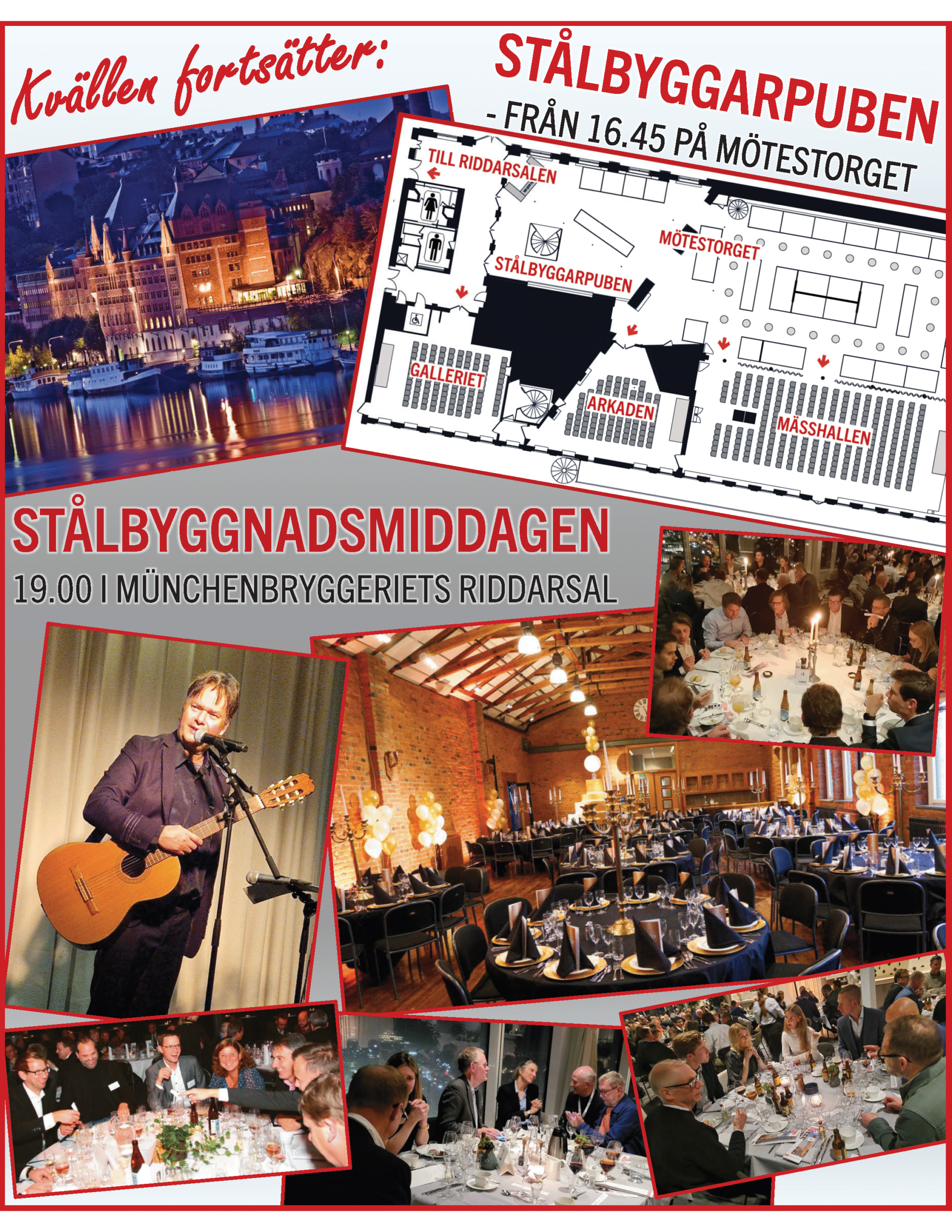 Kl. 19.00 blir det fördrink och därefter Stålbyggnadsmiddag i Riddarsalen på Münchenbryggeriet (anmälan krävs).